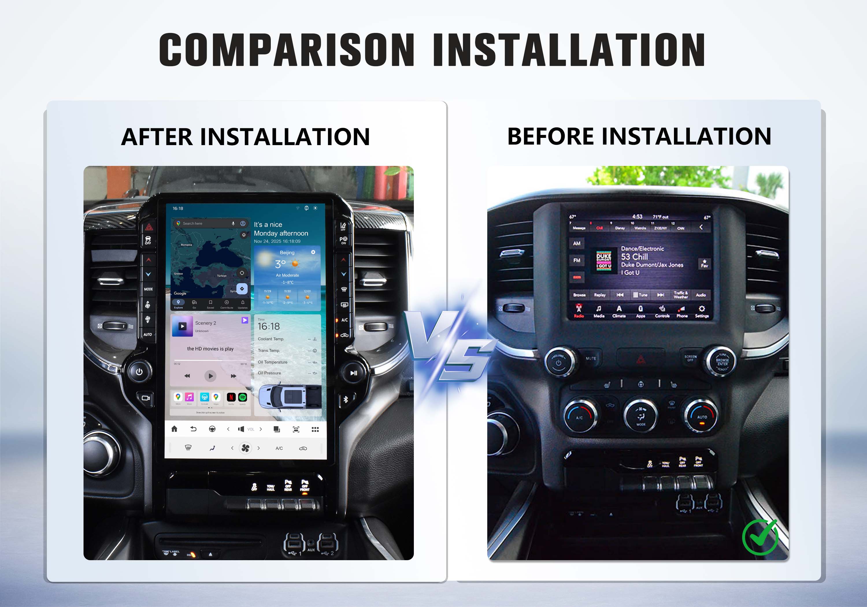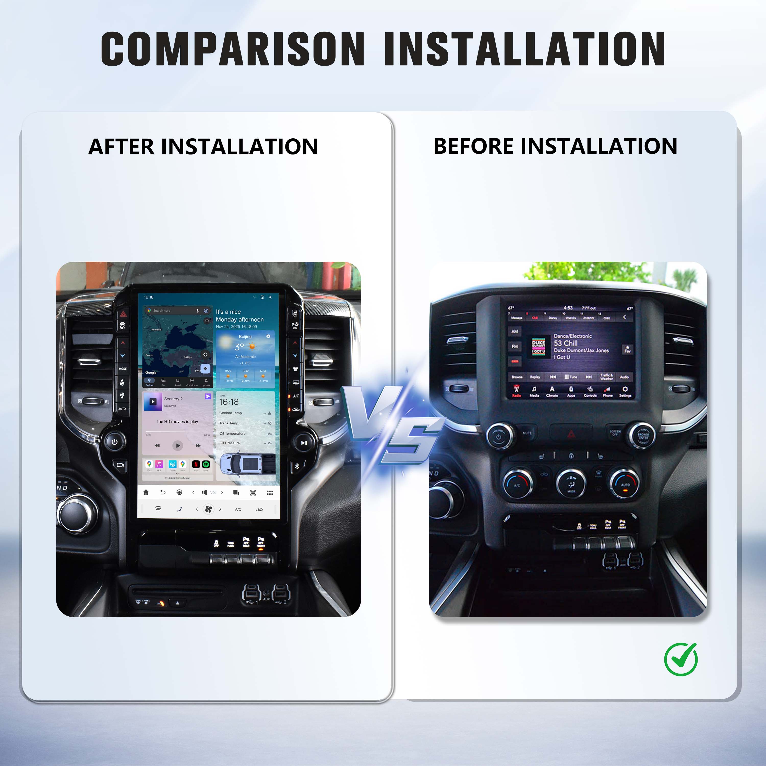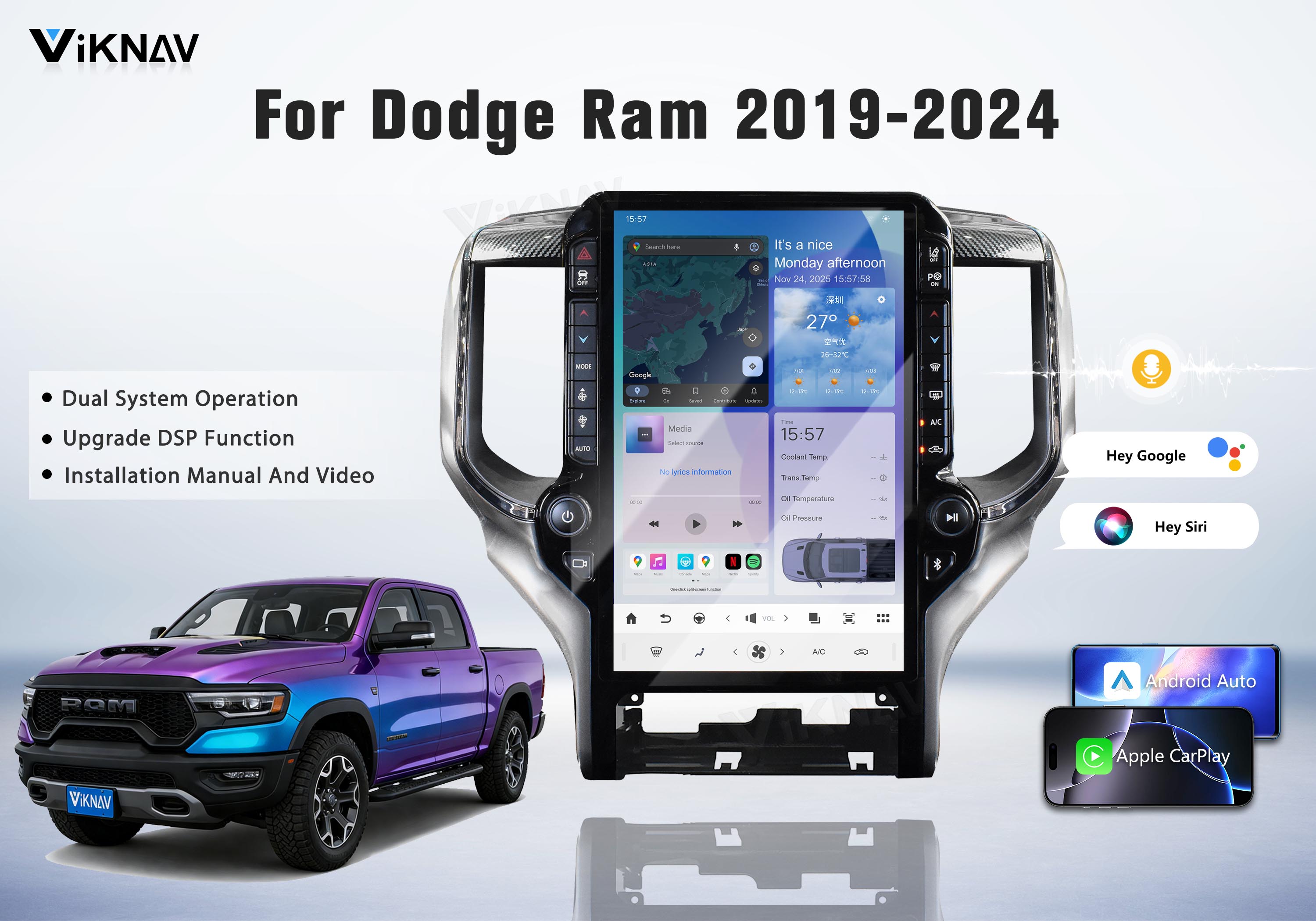 OEM-style vertical screen design, seamlessly integrates with Ram dashboard.