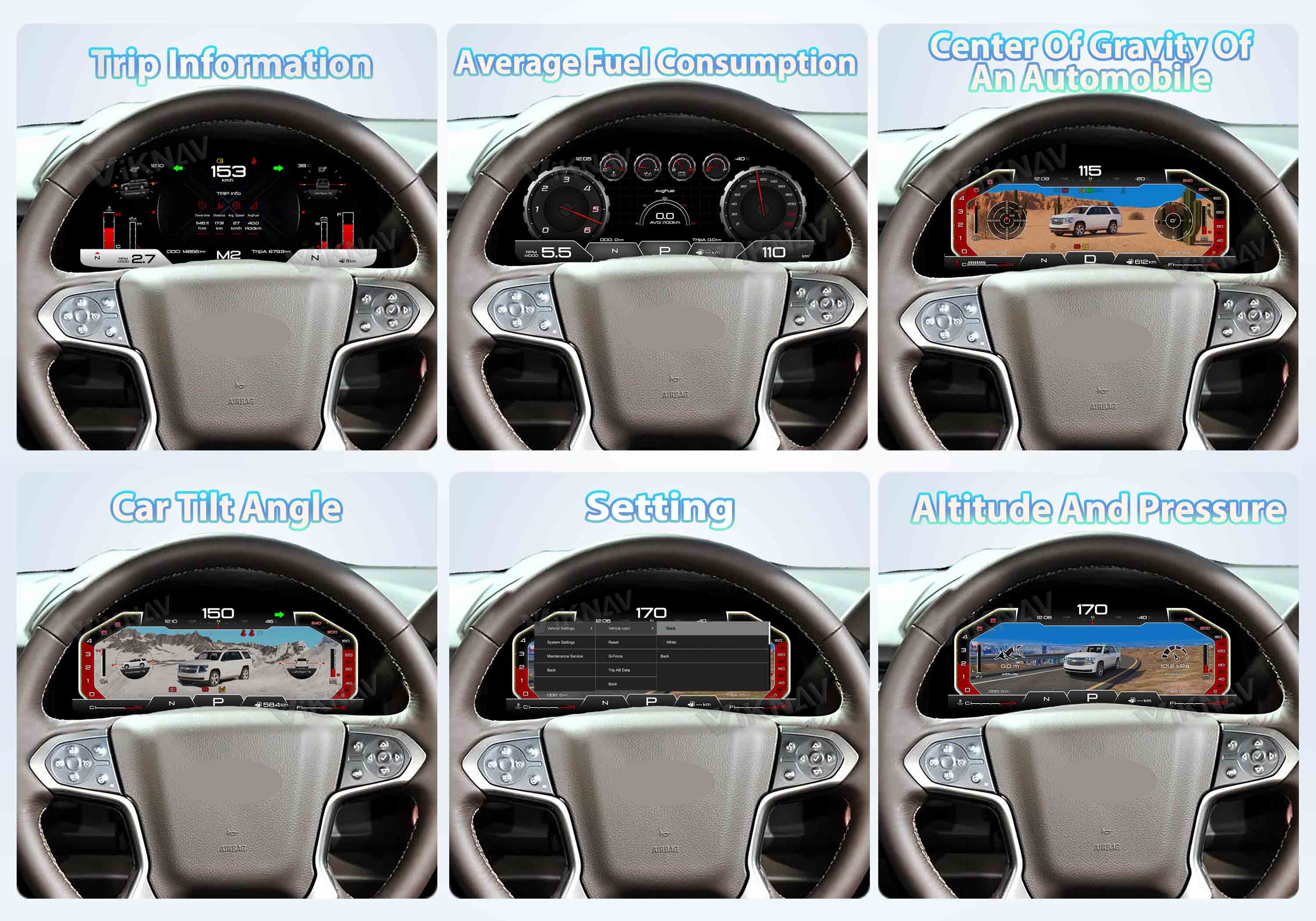 🚗Multi-Functions Display:Support display intelligent data such as transmission temperature, oil temperature, fuel tank scale and water temperature, vehicle tilt display, compass, ambient temperature, mileage display, average fuel consumption, engine speed, vehicle speed, body gravity origin, altitude, barometric pressure, steering wheel angle, etc.which can help you to understand the situation of your car at anytime and anywhere, and provide a more convenient and intelligent driving experience.