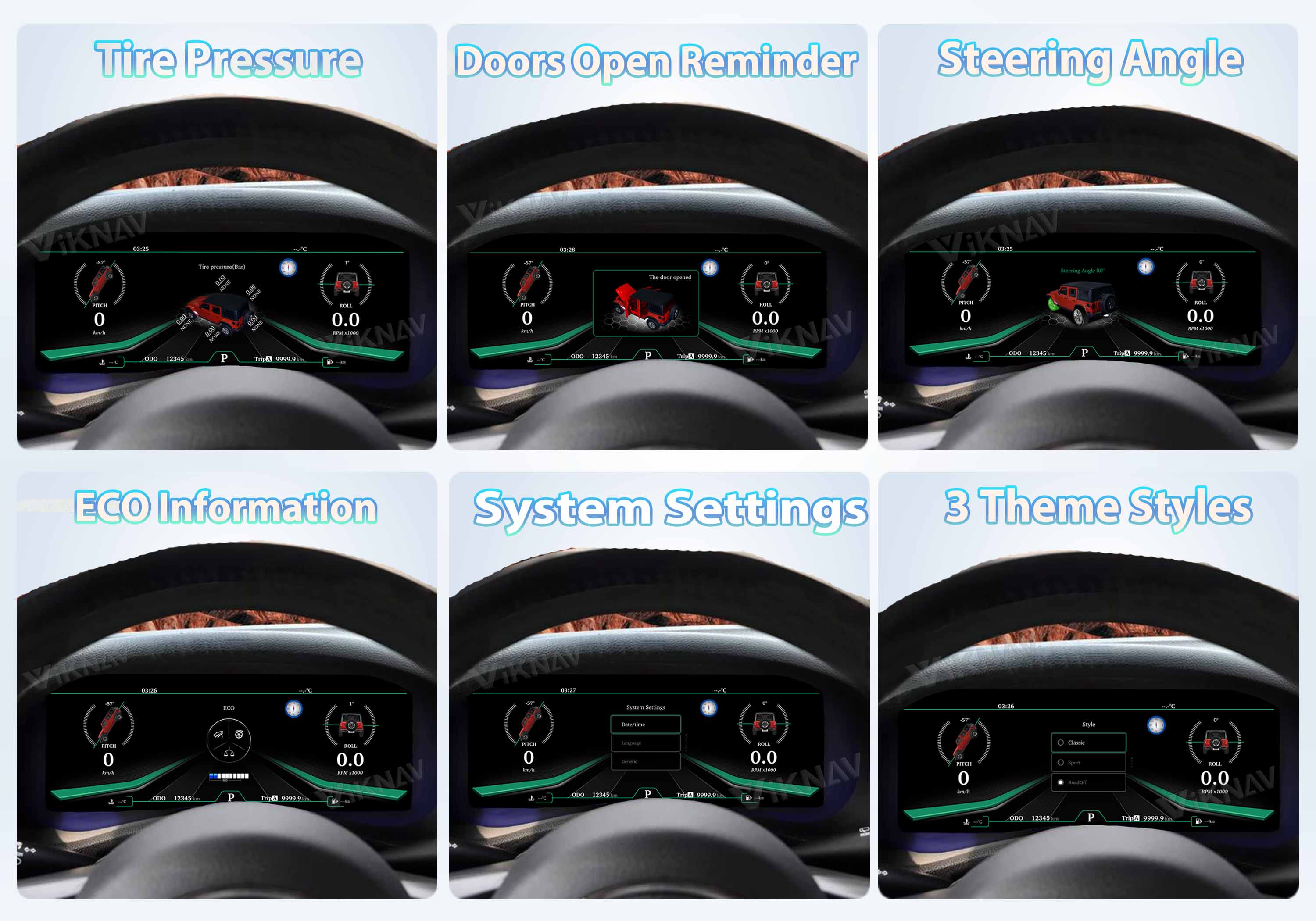 ✅Support various functions--original tires, oil temperature, water temperature, oil display, fuel consumption, and body balance, Time Date Weekly/Ambient temperature/ Altitude/ Atmospheric pressure display, Doors open reminder (four doors/tailgate/hood), 4x4 driver, etc.