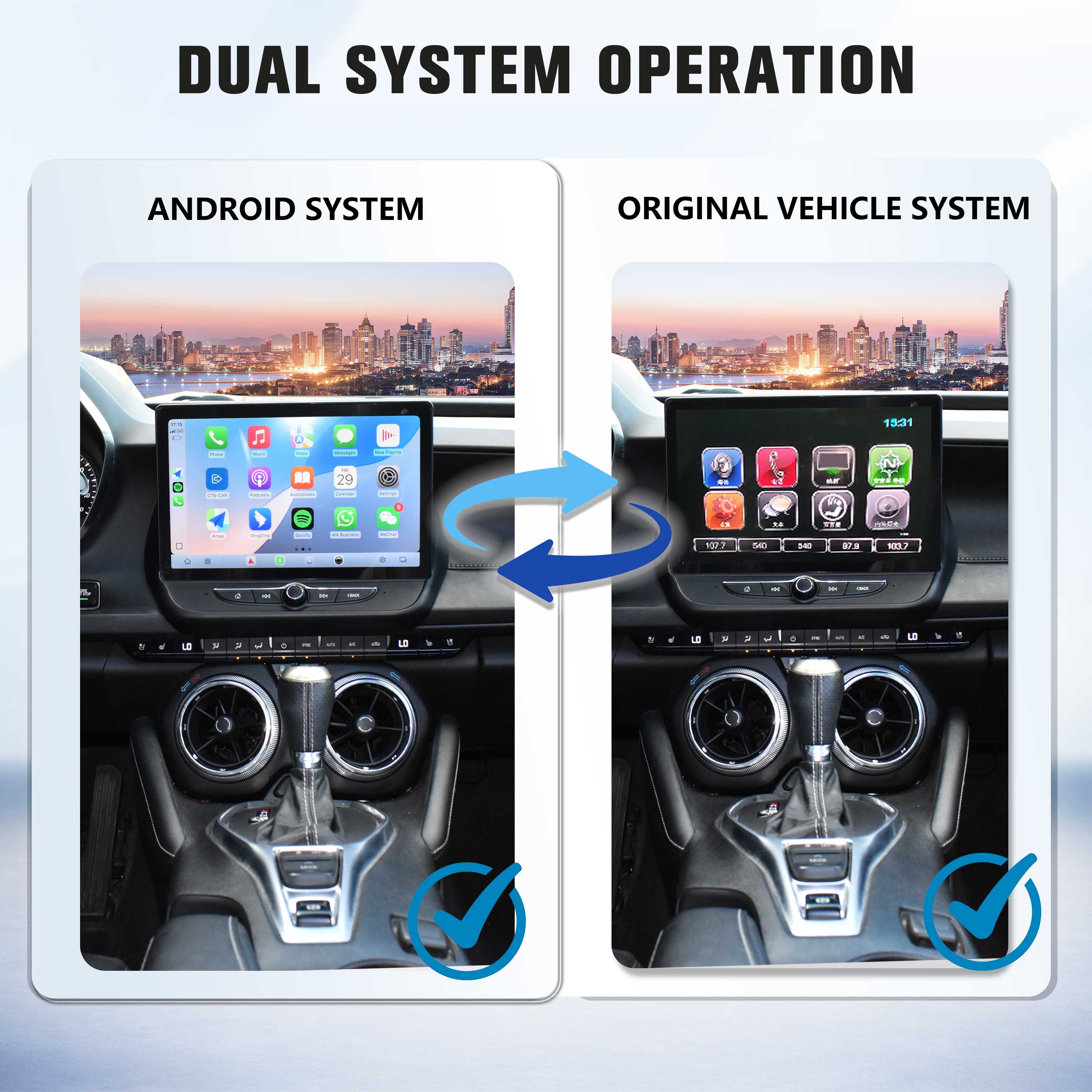 This car radio features dual-system setup (original system + Android system), allowing you to switch freely between both for a smarter driving experience.