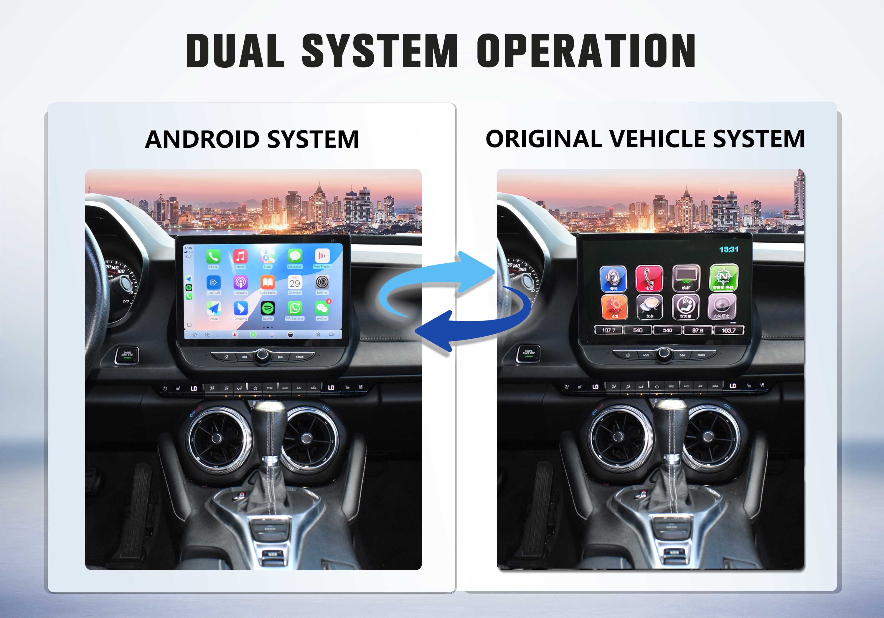 This car radio features dual-system setup (original system + Android system), allowing you to switch freely between both for a smarter driving experience.