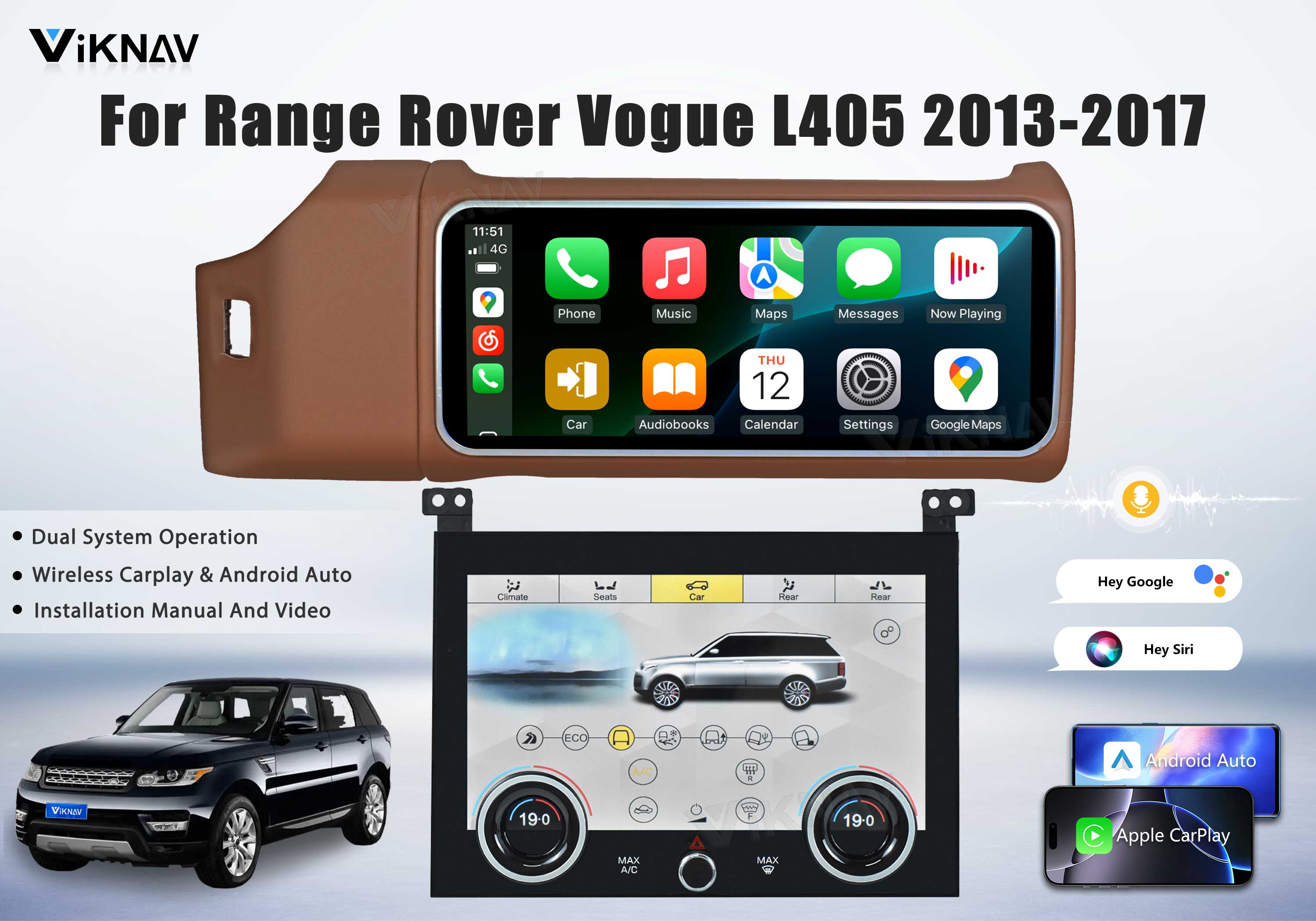 Viknav 12.3 inch Android Radio AC Panel For Land Rover Range Rover Vogue L405 2013-2017 Wireless Carplay Android Auto Multimedia player GPS Navigation Auto Stereo Air Conditioning Touch Screen(Brown)
