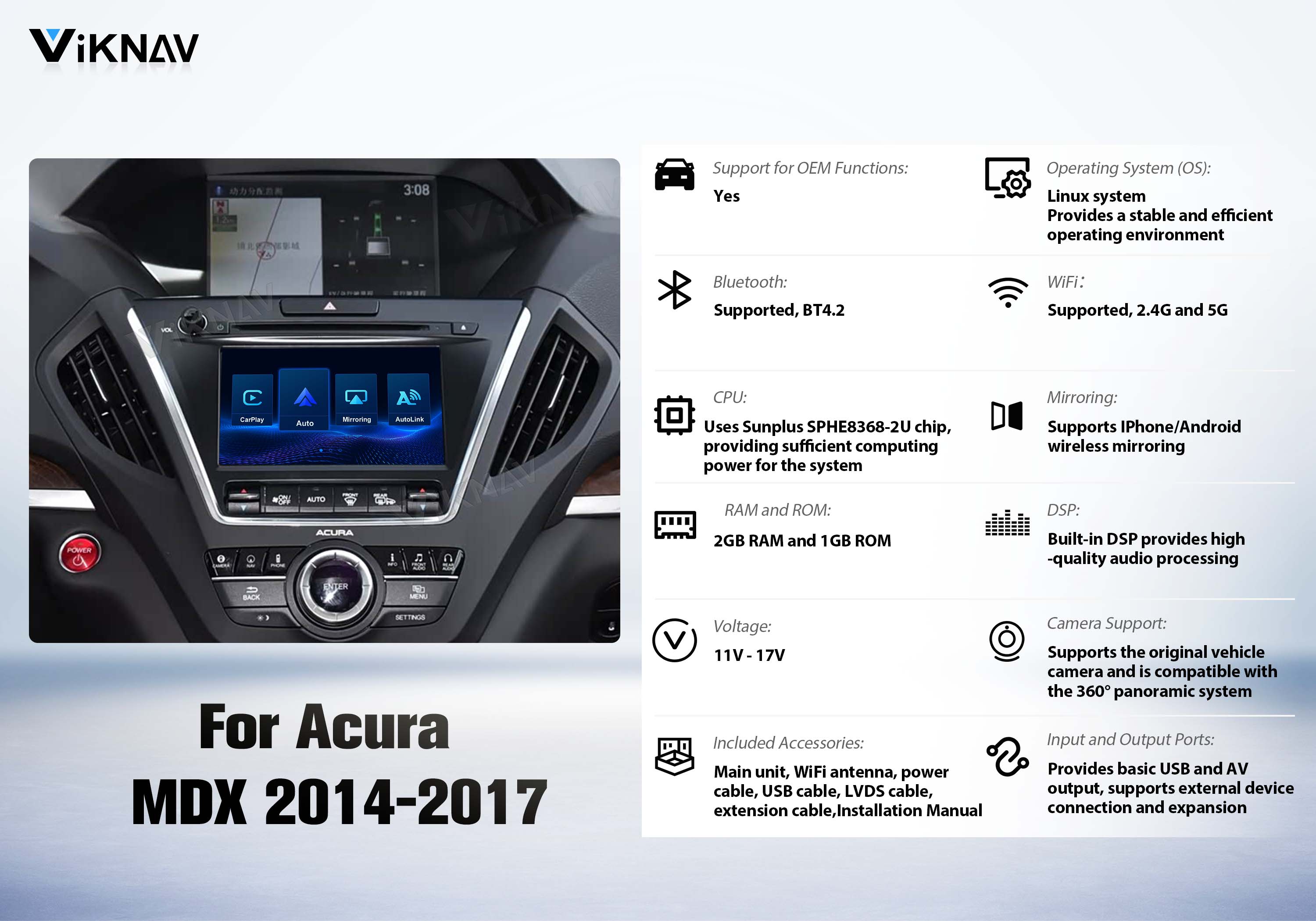 Viknav Linux System Wireless Carplay Android Auto Decorder Box For Acura MDX 2014-2017 GPS Navigatipn Original Car Radio Screen