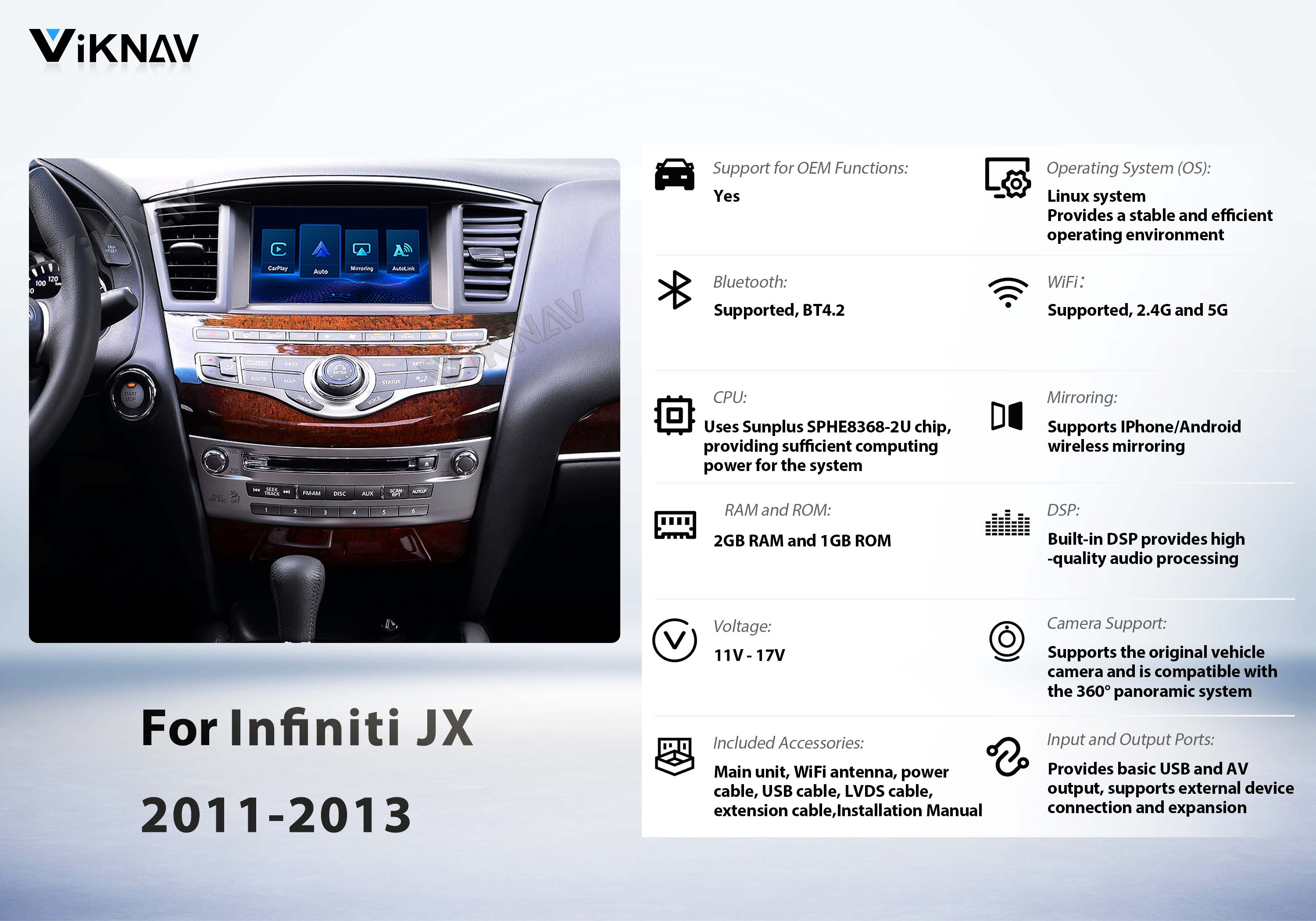 Viknav Linux System Wireless Carplay Android Auto Decorder Box For Infiniti JX 2011-2013 GPS Navigatipn Original Car Radio Screen