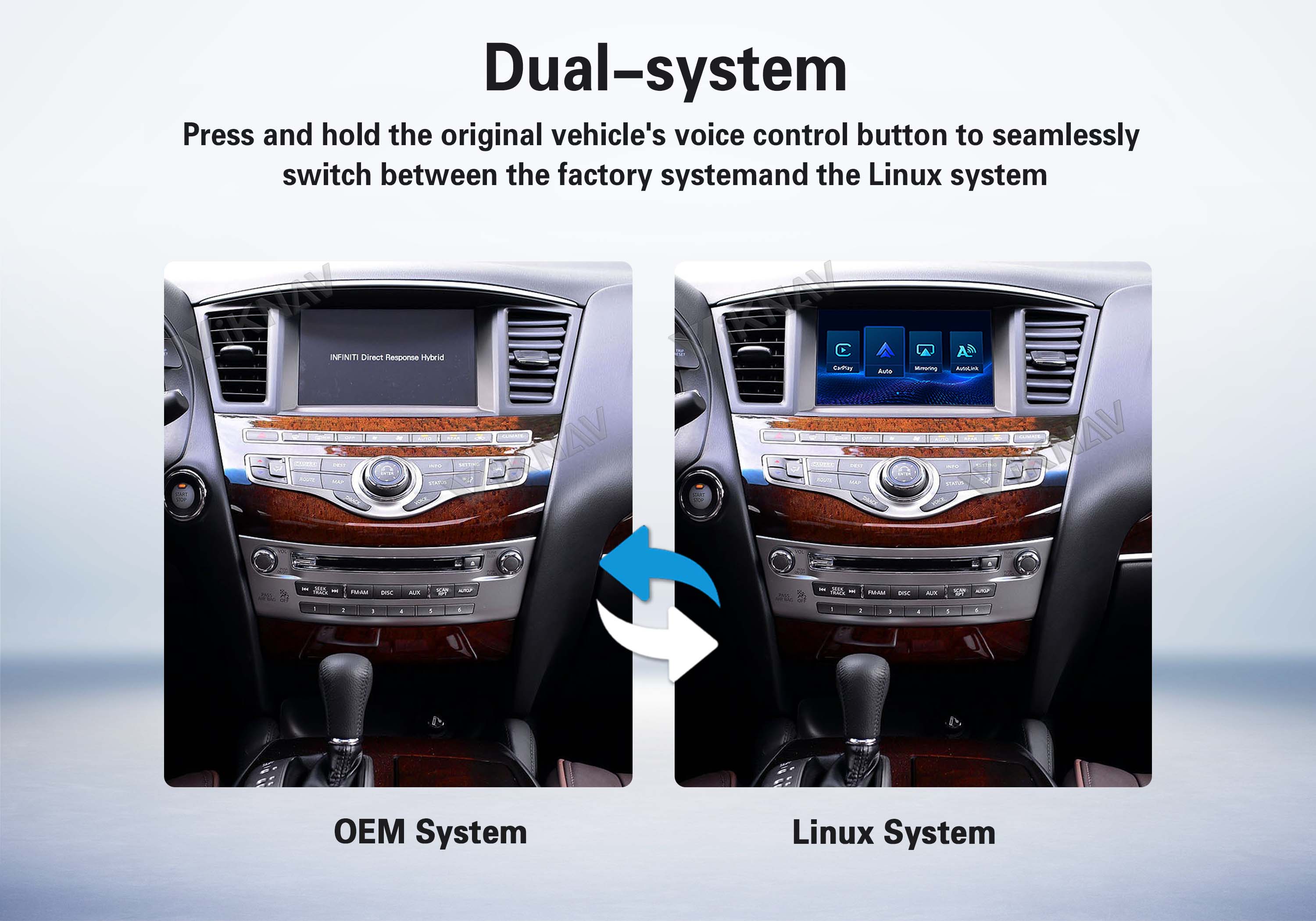 ✅How to swicth Linux System to OEM System:Press and hold the "HOME" or "MENU"button to switch to the original car system